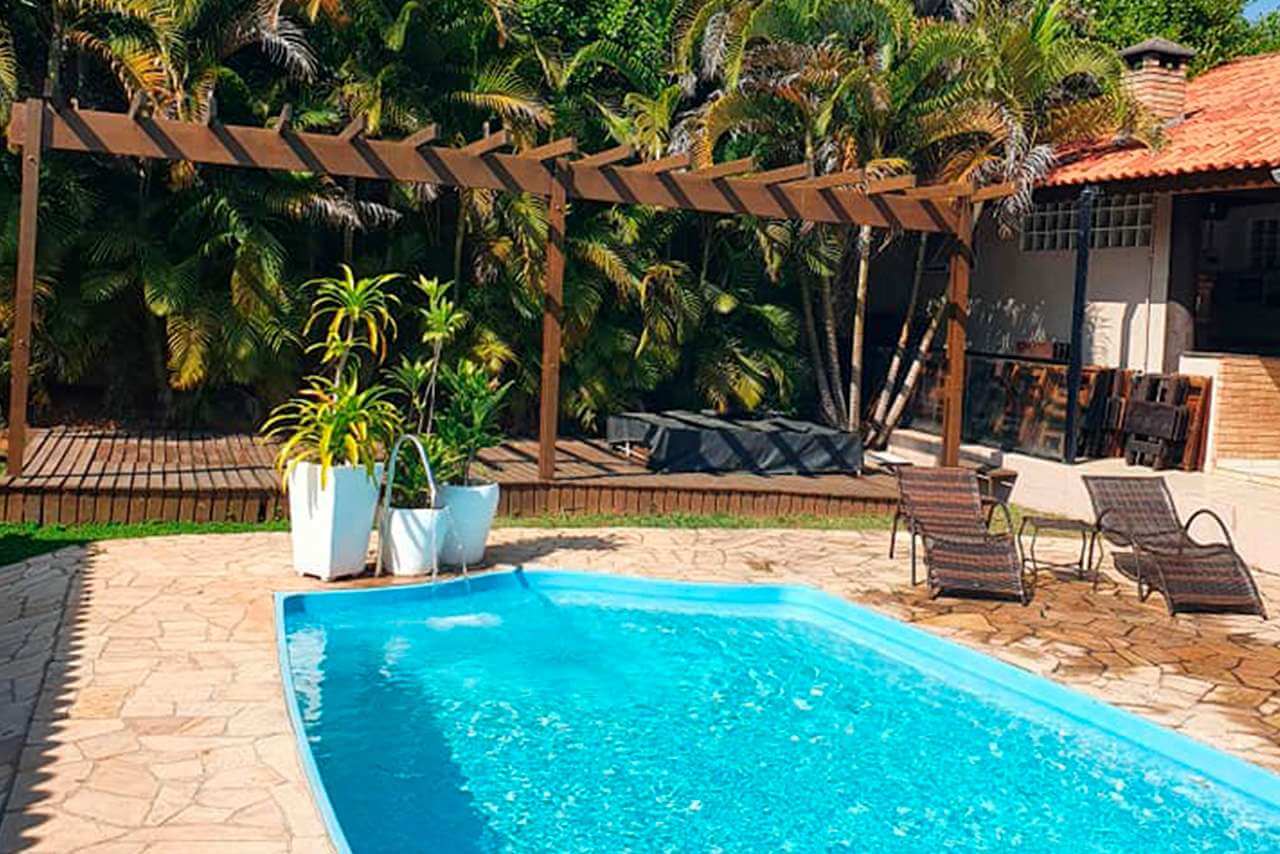 Piscina de 7m x 3m, com profundidade de 1,40m Área livre da piscina: 77m2 mais deck de madeira de 32m2 Espaço coberto junto à piscina, contendo mesa de snooker e sauna adaptada para dormitório, com 3 beliches, arara para roupas, ventilador, chuveiro e espelho.